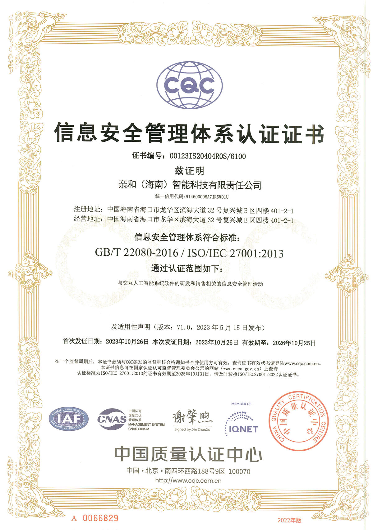2023年10月26日,亲和智能顺利通过国际标准ISO27001信息安全管理体系认证,该国际标准体系认证的成功意味着亲和智能的信息安全管理达到国际先进水平,在技术、流程和组织三个层面具备全面的数据安全保护能力,此次顺利通过认证对于公司发展具有重要的里程碑意义。